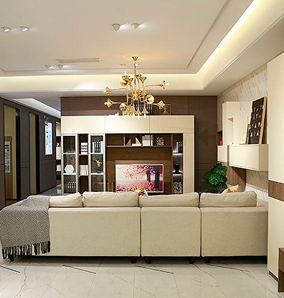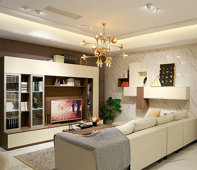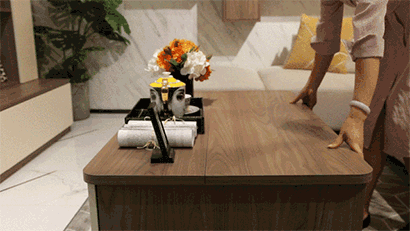 茶几结合储物与办公于一体,台面可自由升降,兼具收纳和办公娱乐功能,电视柜结合平板门和玻璃门,添加感应灯元素,更加时尚美观。