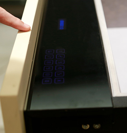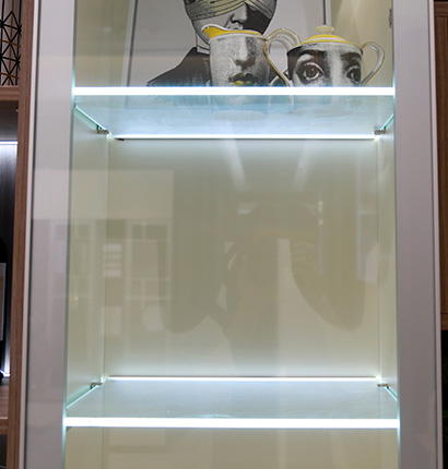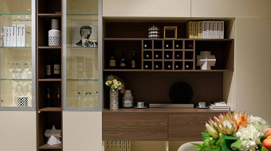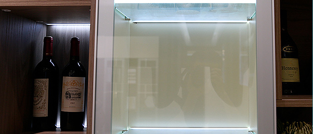 加入时尚感十足的感应灯带,轻轻感应即可点亮,柔和灯光人性十足,酒架以方格设计,装饰与实用性兼备。