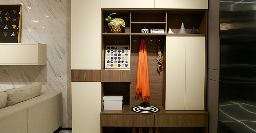 简洁拼色,体现时尚自由的生活态度,入户鞋柜人性化设计,方便换鞋。挂钩方便收纳,为出入提供便利。