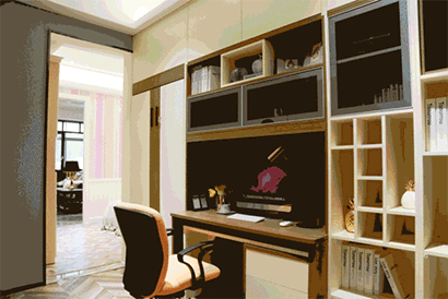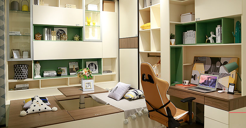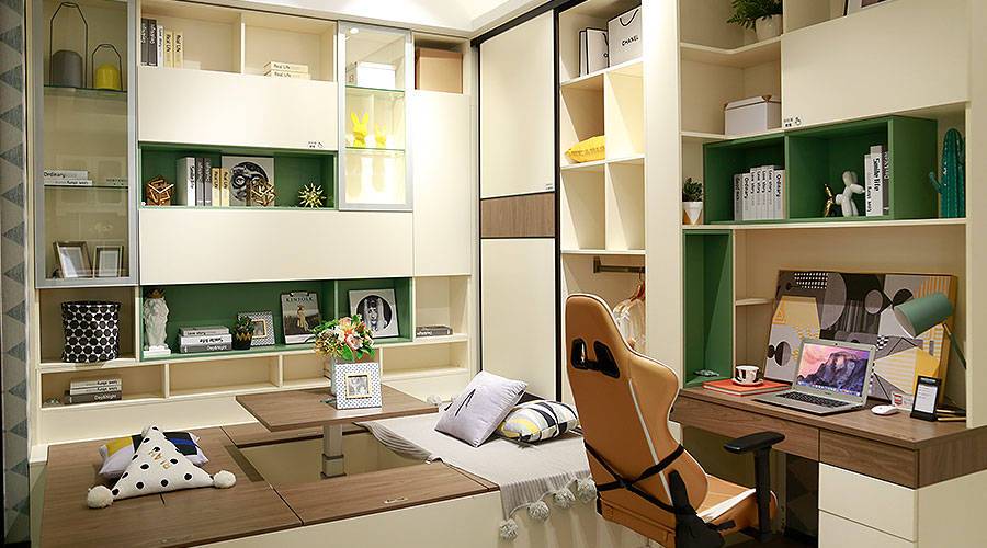 书桌可展开,工作及享受亲子时光皆可实现,柜体采用隐形床设计,展开即可休息,工作狂可就地休息,不用打扰家人。