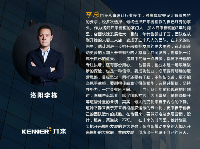 开来定制家居1998年成立于北京,22年专注于家居定制。中国橱柜行业的先锋品牌,并担任中国装修装饰协会住宅分会副会长单位、全装修行业法规标准编委等职务。开来历时10年自行研发打通整个流程的ERP系统,从前端的效果图制作,下单拆单,工厂接单生产的各个环节,全部实现信息化,自动化,整体流程效率行业领先。